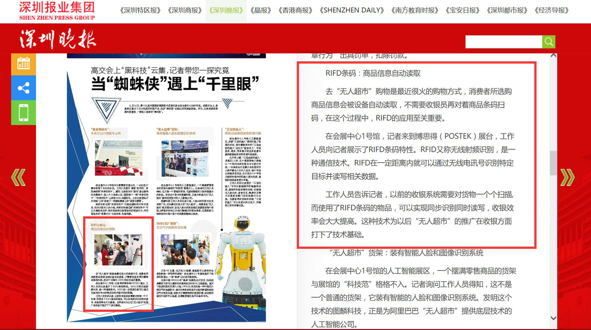 在會展中心1號館,記者來到博思得(POSTEK)展臺,工作人員向記者展示了RIFD條碼特性。RFID又稱無線射頻識別,是一種通信技術。RIFD在一定距離內就可以通過無線電訊號識別特定目標并讀寫相關數據。 工作人員告訴記者,以前的收銀系統需要對貨物一個個掃描,而使用了RIFD條碼的物品,可以實現同步識別同時讀寫,收銀效率會大大提高。這種技術為以后“無人超市”的推廣在收銀方面打下了技術基礎。