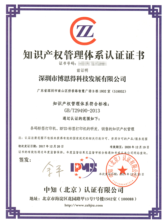 2017年12月20日,深圳市博思得科技發展有限公司憑借其規范完善的知識產權管理體系,喜獲國家《知識產權管理體系認證證書》,標志著博思得科技在知識產權規范化管理、運用及風險防范等方面邁上新臺階。