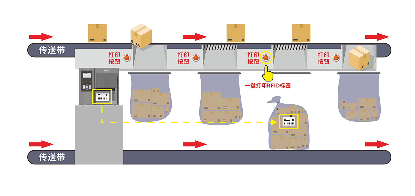 通過軟硬件互聯配合,在自動分揀系統中,作業員通過分揀閘口邊的一個開關就能自動控制一旁嚴正以待的POSTEK RFID打印機,真正實現了“傻瓜化”的一鍵操作打印功能,簡單便利的操作,不僅降低了作業難度,提升分揀工作效率和準確率,還保障了整個自動分揀系統快速、穩定和持續的運行。