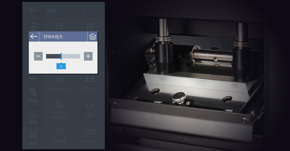 工作中,打印壓力會受標簽材質、打印速度、膠輥直徑、機身結構等因素影響,因此一臺長期用于產線上的條碼打印機打印品質往往帶有不確定性,打印壓力的變化會導致同樣工位的同一臺機器,不同時間打印生成的標簽效果無法完全保持一致。每每遇到這類情況,傳統的解決辦法是通過手動調節打印頭壓力來實現用戶滿意的打印效果,但由于手動調節的精確度很難把控,沒有多年經驗的專業工程師是很難完成準確調節的。